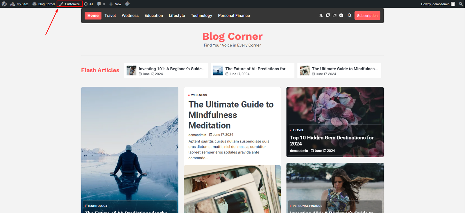 You can access Customize from any page or post on the site customize option is in the top-left corner, and clicking on Customize to customize the website.