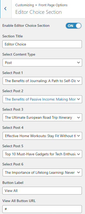 - In this section pane, you can enable/disable the Editor Choice section to display Posts on the Frontpage; otherwise, disable it to hide.