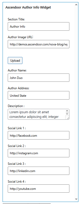 - After selecting the widget section, click on the Add a Widget button, then select the Ascendoor Author Info Widget. The user will see the following options: