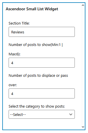 - After selecting the widget section, click on the Add a Widget button, then select the Ascendoor Small List Widget. The user will see the following options: