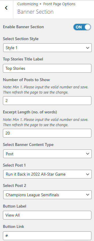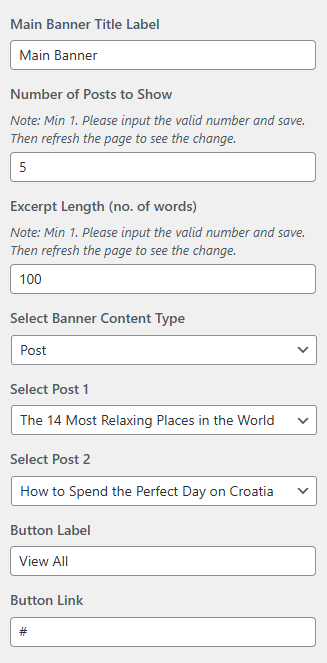 • Number of Banner Posts to Show: You can set the number of posts to display in the banner section. *Note: Please input a valid number and save. Then refresh the page to see the change.