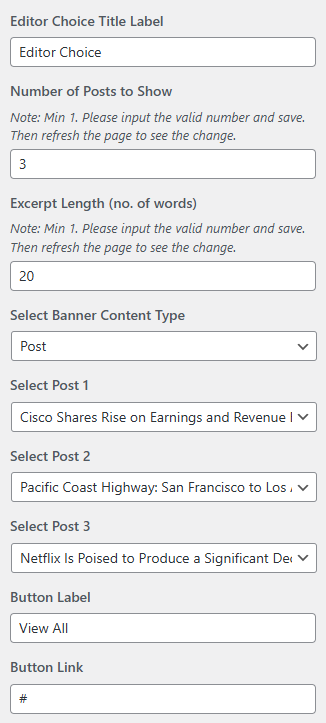 • Number of Editor Posts to Show: You can set the number of posts to display in the Editor Choice section. *Note: Please input a valid number and save. Then refresh the page to see the change.