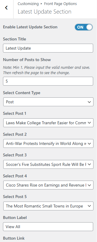 • To configure the Latest Update Section. You need to navigate from Admin Panel > Appearance > Customize > Front Page Options > Latest Update Section.