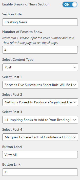 • Select Content Type: Page / Post / Category / Recent for the Breaking News section.