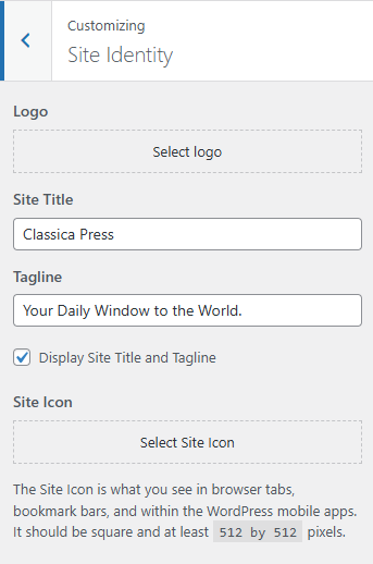 • Site Icon: Upload the Site Icon for the browser icon and app icon for your site. The icon must be square and at least 512px wide and tall.
