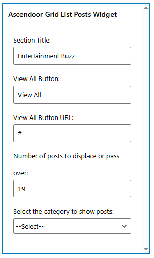 • After selecting the widget section, click on the Add a Widget button, then select the Ascendoor Posts Grid Widget. The user will see the following options: