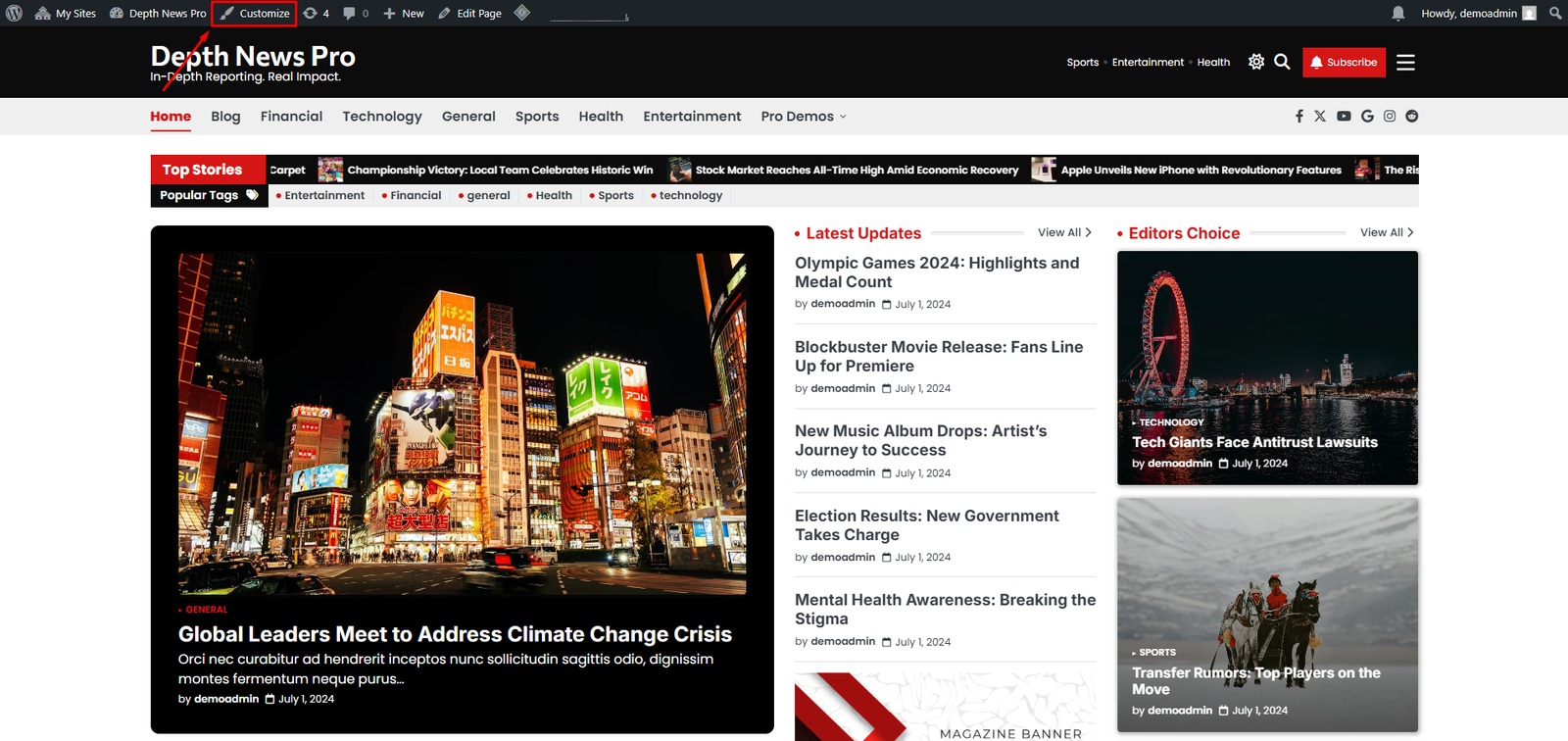 You can access Customize from any page or post on the site, customize option is in the top-left corner, and clicking on Customize to customize the website.