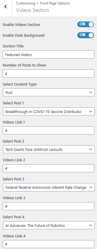 - In this section pane, you can enable/disable the Video section to display Posts on the Frontpage; otherwise, disable it to hide.