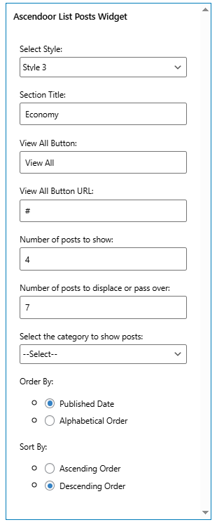 - After selecting the widget section, click on the Add a Widget button, then select the Ascendoor Posts List Widget the user will see the following options: