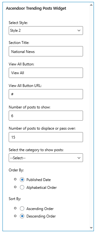 - After selecting the widget section, click on the Add a Widget button, then select the Ascendoor Trending Posts Widget the user will see the following options: