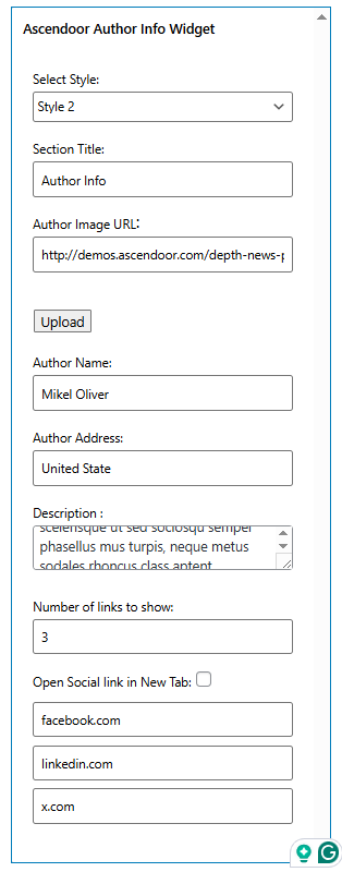 - After selecting the widget section, click on the Add a Widget button, then select the Ascendoor Author Info Widget the user will see the following options: