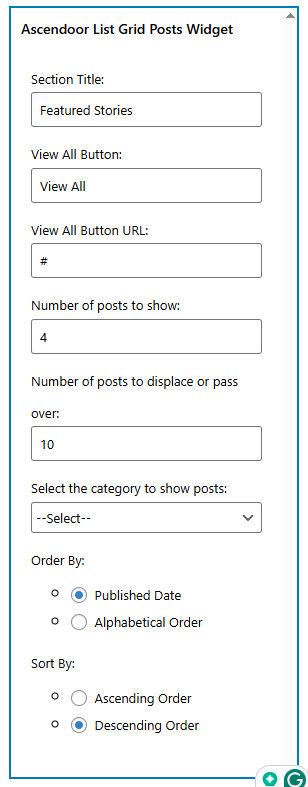 - After selecting the widget section, click on the Add a Widget button, then select the Ascendoor Posts Grid Widget the user will see the following options: