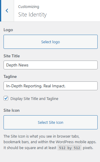 - Site Icon: Upload the Site Icon for the browser icon and app icon for your site. The icon must be square and at least 512px wide and tall.
