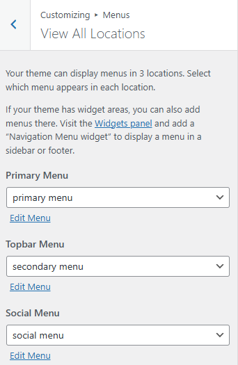 After creating the new menus, you can set the different menu locations, from > Customize > Menus > Menu Locations. The menu will be displayed in the selected location.