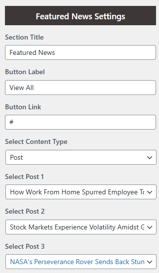 - Section Title: This setting allows the user to set the Featured News Section title.
