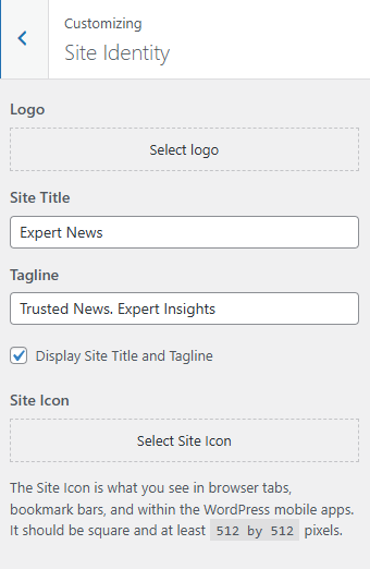 Navigate to the Customize section and go to Site Identity to integrate Site Identity’s multiple identity options, such as: