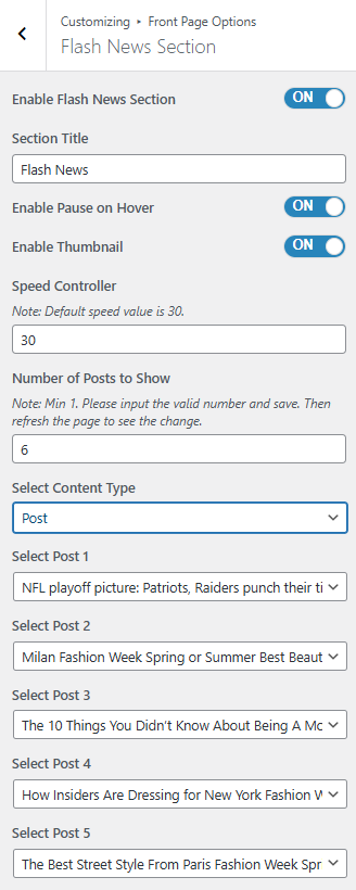 You can set the pages/posts/categories for the Flash News Section and set different other options for the Flash News Section.