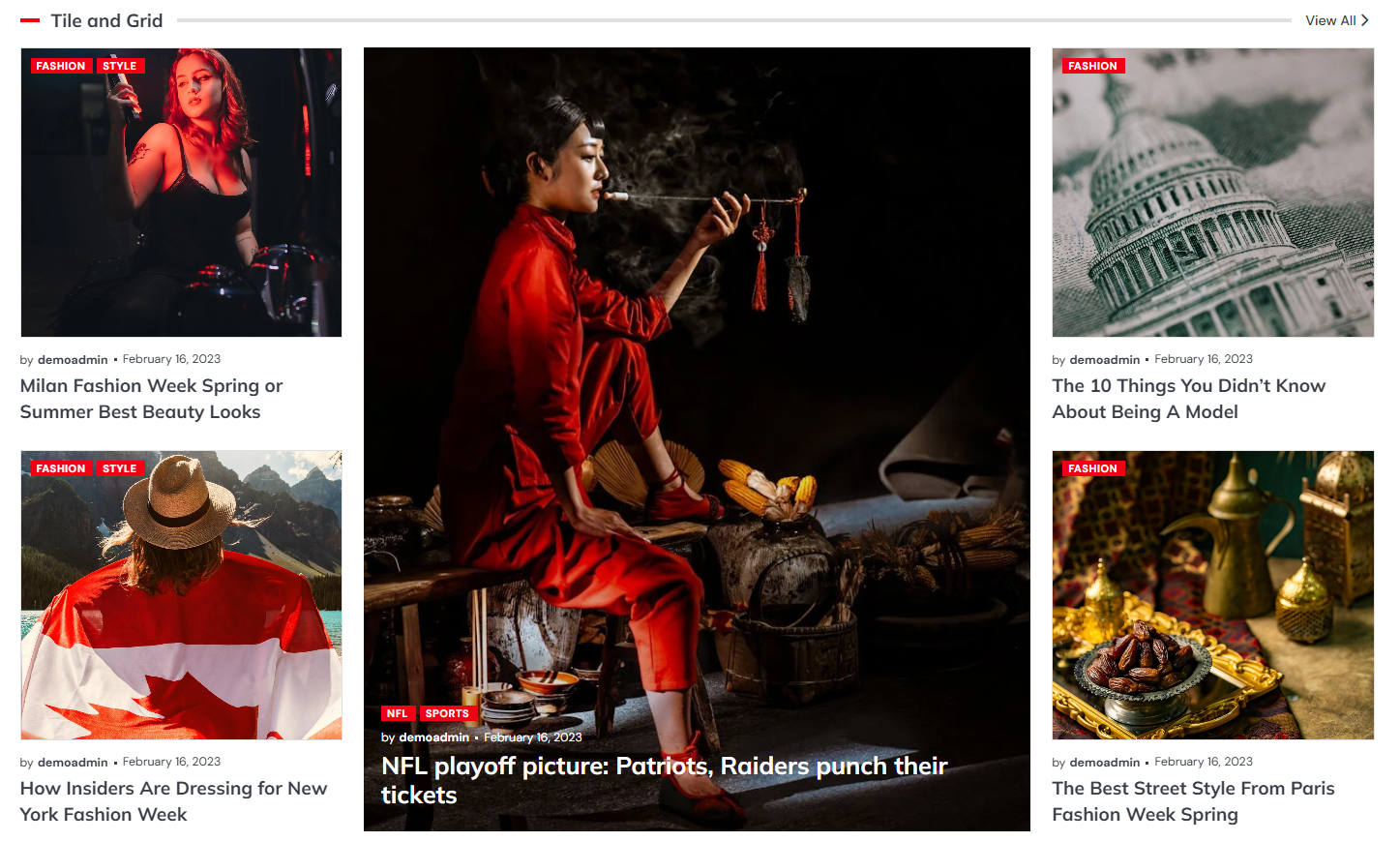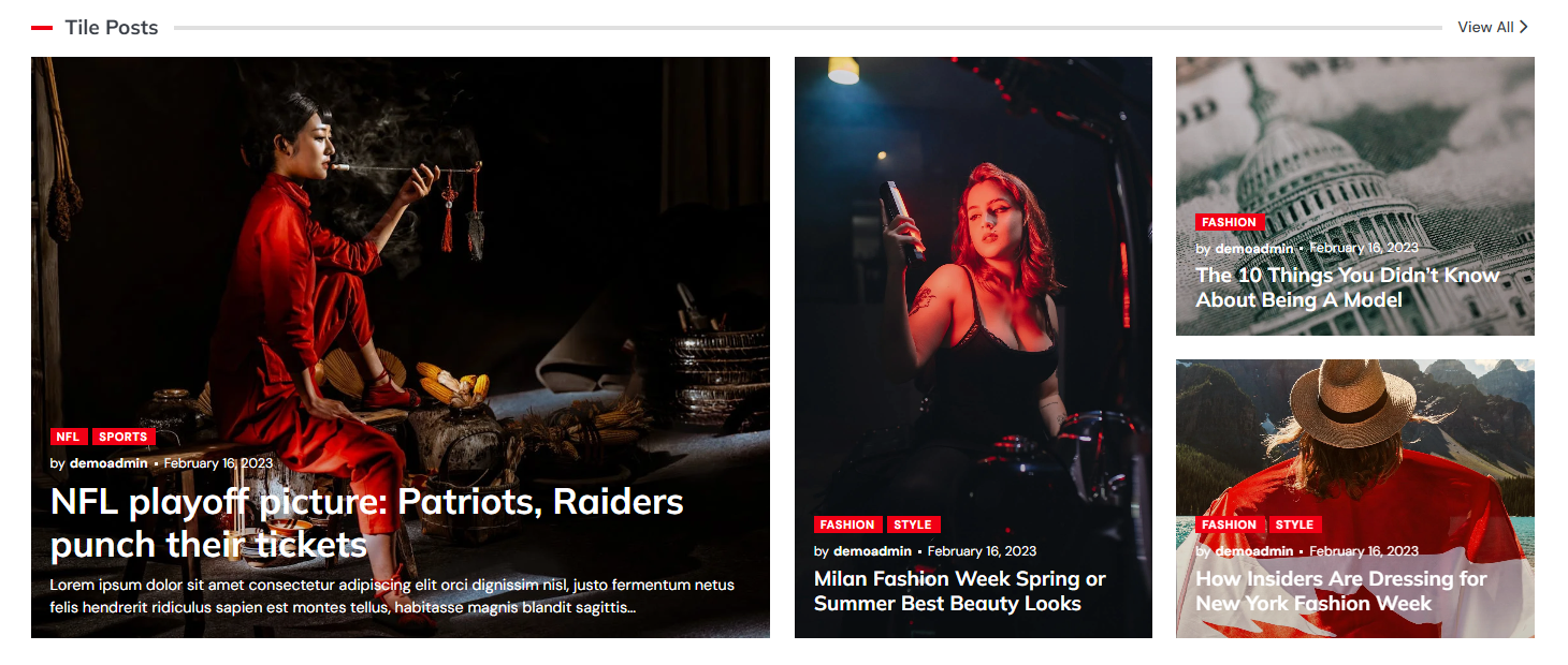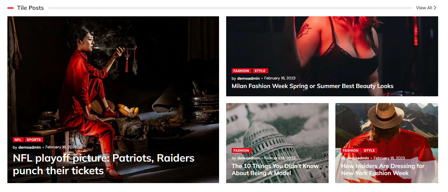 • Section Style: This setting allows you to select between two different styles for the Posts Tile and Grid Section. You can select the preferred style for the section.
