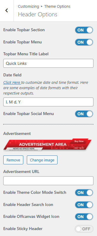 - Advertisement Image: This setting allows the user to set the header advertisement image.