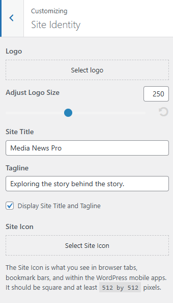 - Display Site Title and Tagline: This option allows users to enable and disable the display of the title and the tagline on the site.