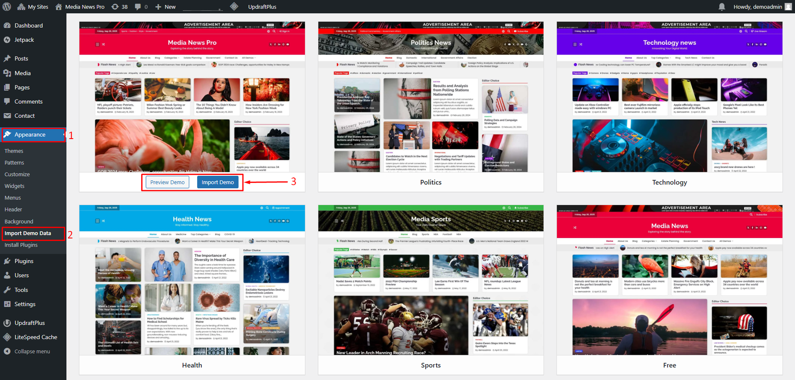 - After installing and activating the One Click Demo Import plugin, navigate to the Dashboard > Appearance > Import Demo Data > Import Demo.
