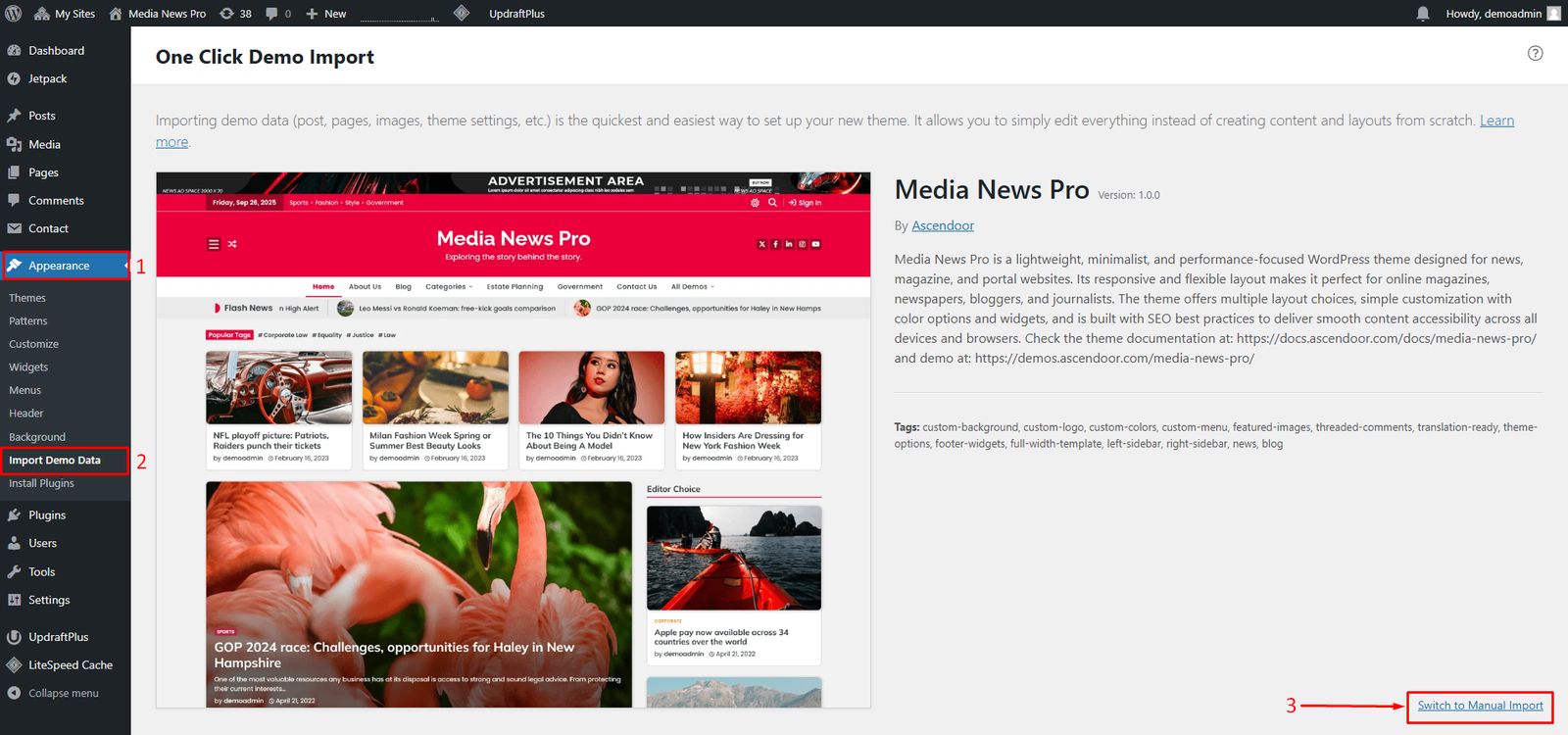 - Now navigate to the Dashboard > Appearance > Import Demo Data > Switch to Manual Import and select the respective files for Import Content, Import Widgets, and Import Customizer.