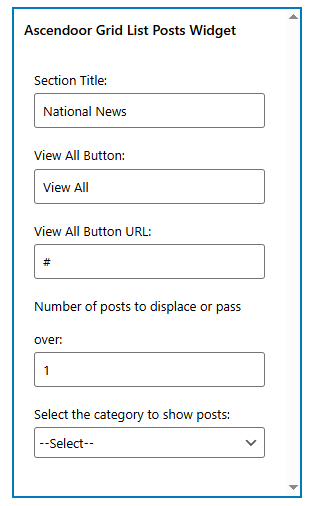 • After selecting the widget section, click on the Add a Widget button, then select the Ascendoor Grid and List Posts Widget. The user will see the following options: