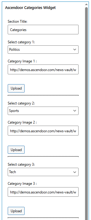 • After selecting the widget section, click on the Add a Widget button, then select the Ascendoor Categories Widget, and the user will see the following options: