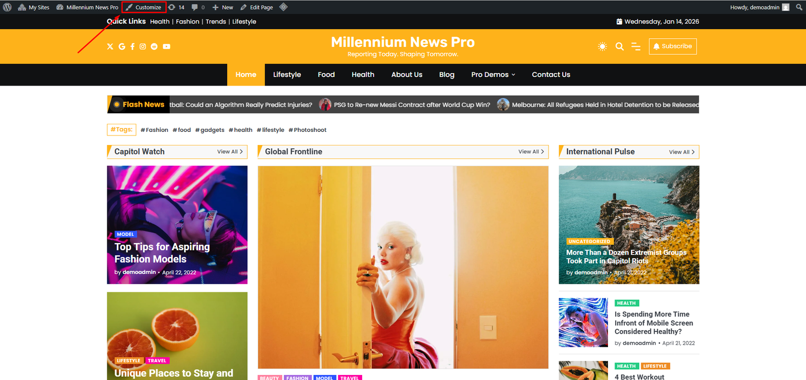 You can access Customize from any page or post on the site, customize option is in the top-left corner, and clicking on Customize to customize the website.