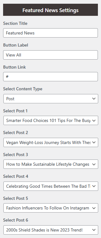 • Select Content Type: Post / Category for the Featured News section.
