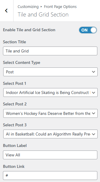 • In this section pane, you can enable/disable the Tile Grid section to display Posts on the Frontpage, or disable it to hide.