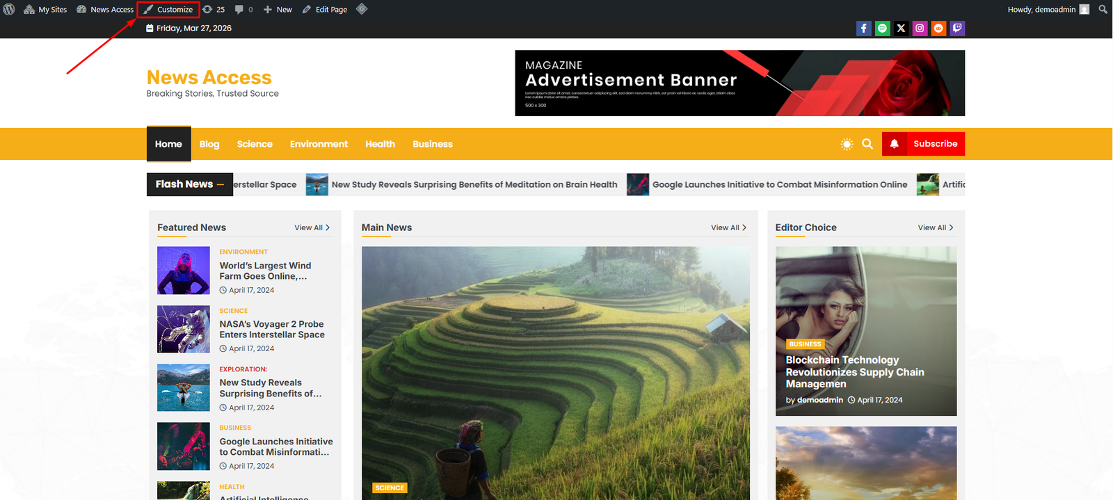 You can access Customize from any page or post on the site, customize option is in the top-left corner, and click on Customize to customize the website.