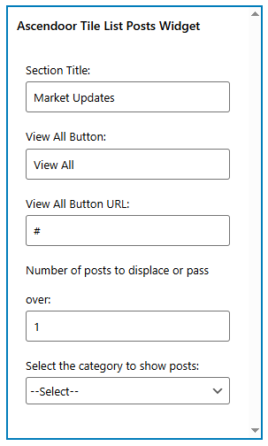 - After selecting the widget section, click on the Add a Widget button, then select the Ascendoor Tile Posts Widget the user will see the following options: