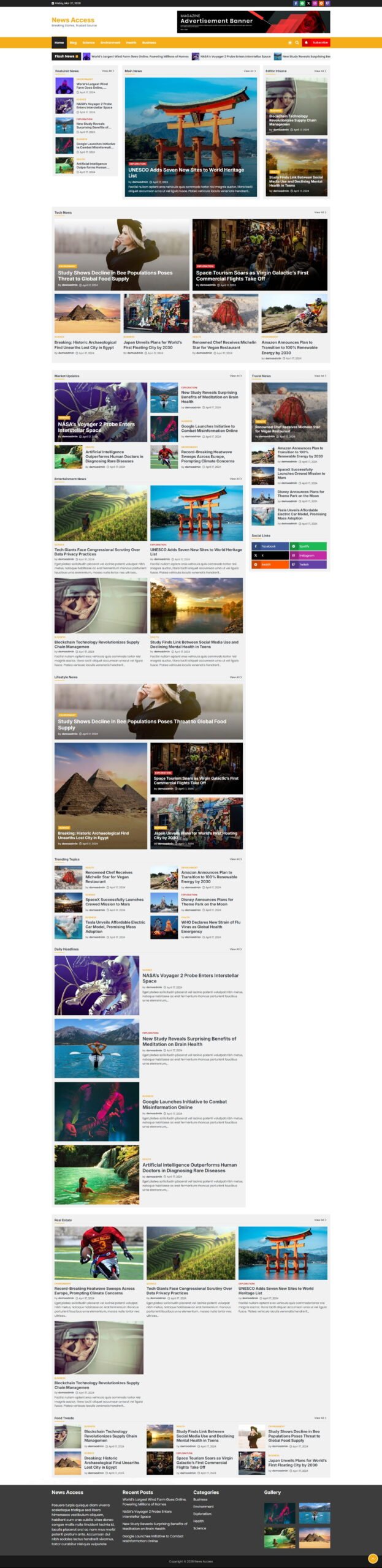 News Access is a clean and contemporary WordPress theme designed for news sites, online magazines, and content-driven platforms. With its minimalist style and user-friendly layout, it provides multiple flexible design options, customizable color schemes, and widget-ready sections for effortless personalization. Built with performance and SEO in mind, it ensures fast loading speeds and better visibility in search engine results. Its fully responsive design guarantees a smooth and consistent experience across all devices and browsers, making it a perfect choice for bloggers, journalists, and digital publishers.