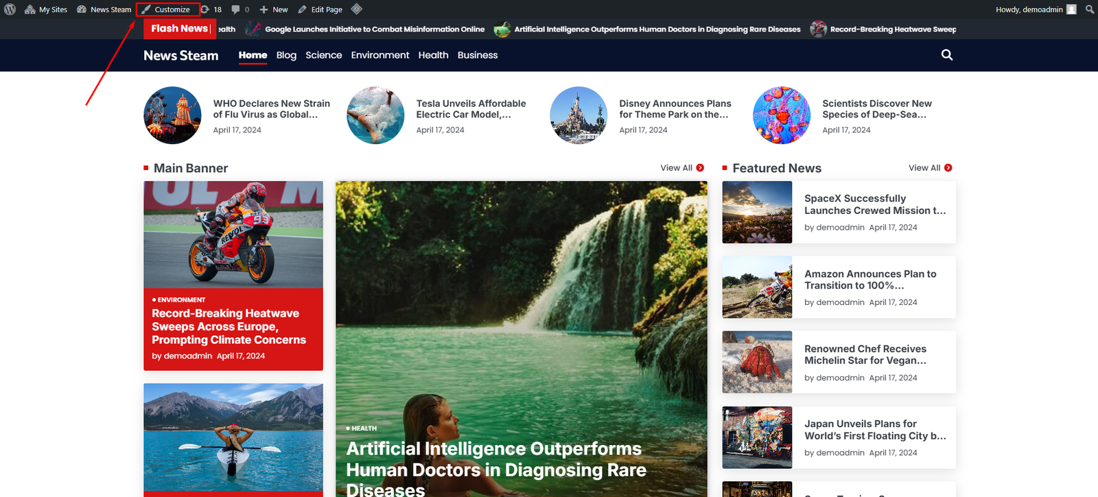 You can access Customize from any page or post on the site, customize option is in the top-left corner, and clicking on Customize to customize the website.