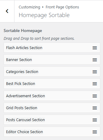 - To configure the Home Page Sortable Section, you need to navigate from Admin Panel > Appearance > Customize > Front Page Options > Home Page Sortable.