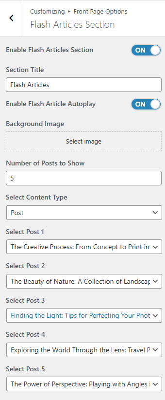 - Select Content Type: Page / Post / Category / Recent for the flash news section.