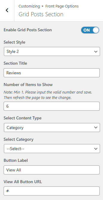 - To configure the Grid Posts Section. You need to navigate from Admin Panel > Appearance > Customize > Front Page Options > Grid Posts Section.