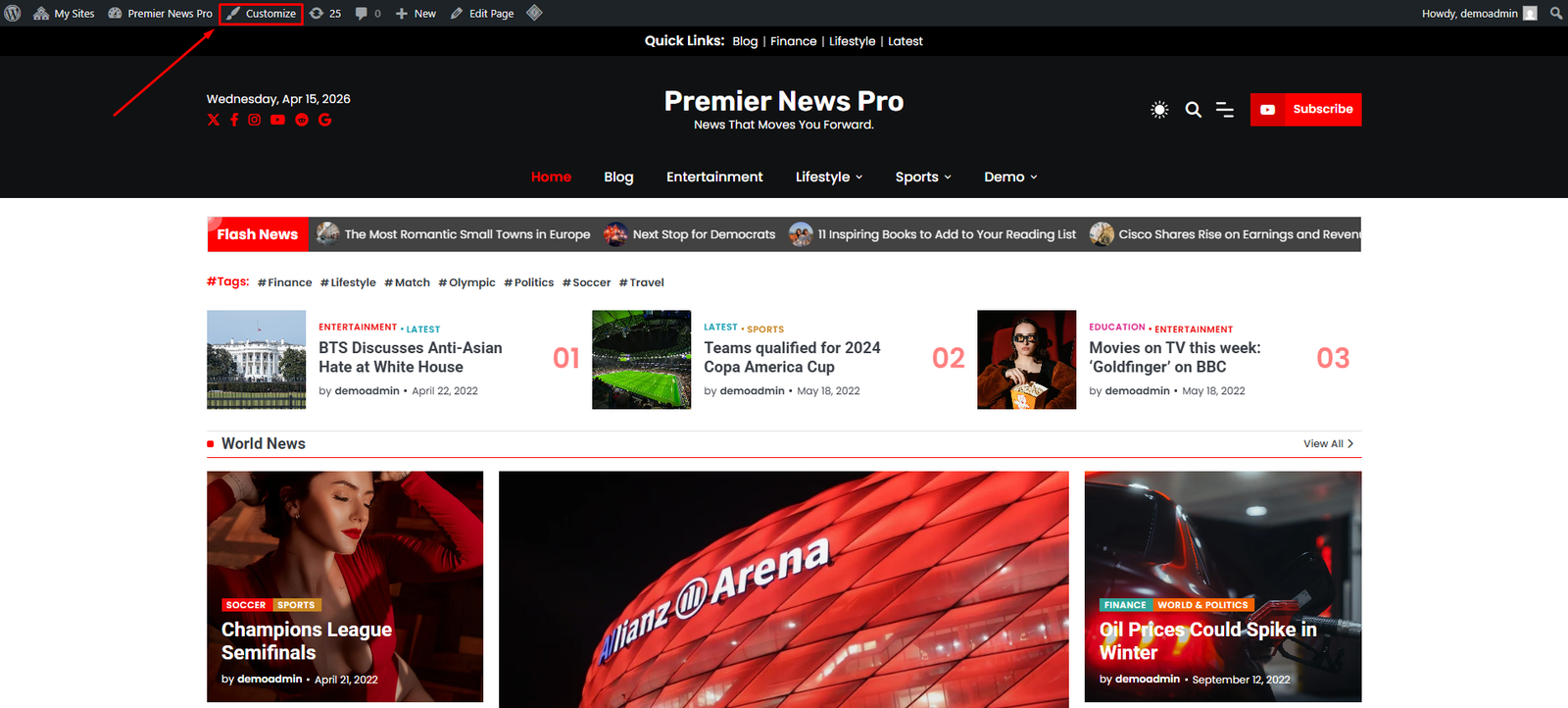 You can access Customize from any page or post on the site, customize option is in the top-left corner, and clicking on Customize to customize the website.