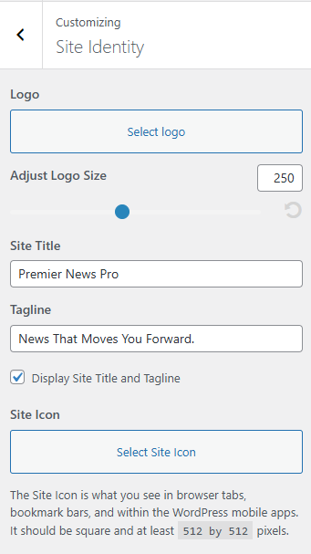 - Site Icon: Upload the Site Icon for the browser icon and app icon for your site. The icon must be square and at least 512px wide and tall.