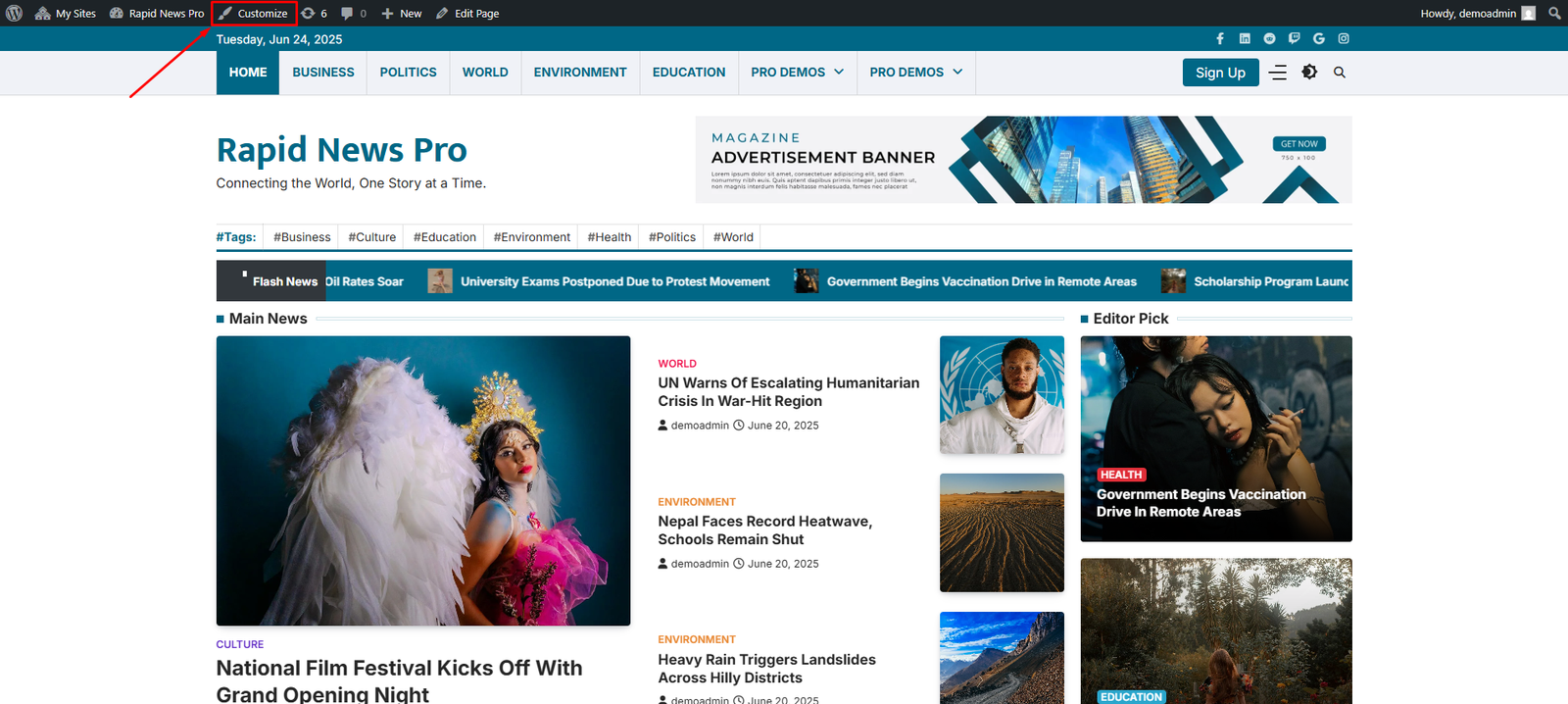 You can access Customize from any page or post on the site, customize option is in the top-left corner, and click on Customize to customize the website.