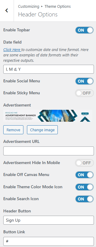 - Advertisement: In this setting, you can set an advertisement image to appear in the header.