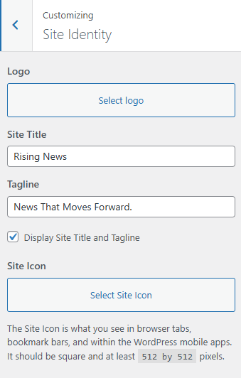 - Site Icon: Upload the Site Icon for the browser icon and app icon for your site. The icon must be square and at least 512px wide and tall.