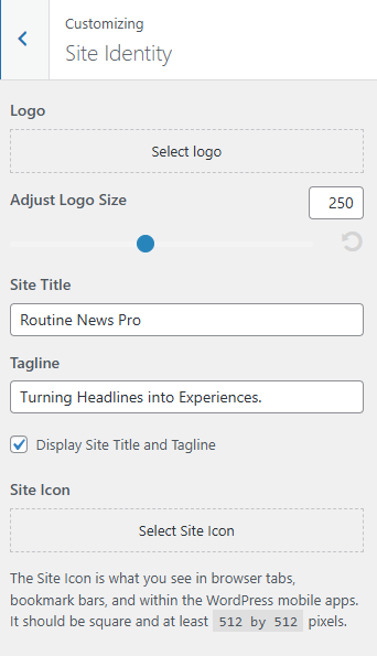 - Site Icon: Upload the Site Icon for the browser icon and app icon for your site. The icon must be square and at least 512px wide and tall.