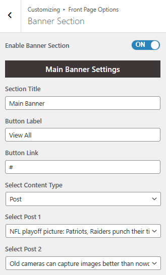 - To configure the Banner Section, you need to navigate from Admin Panel > Appearance > Customize > Front Page Options > Banner Section.