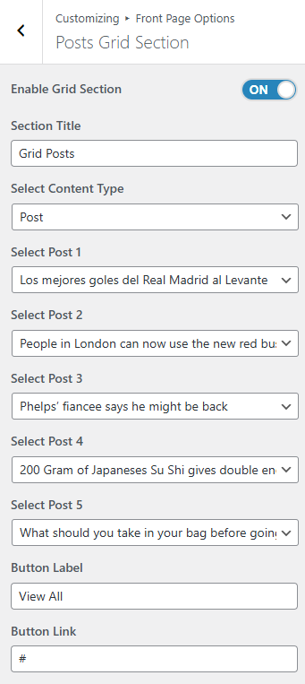 - To configure the Post Grid Section. You need to navigate from Admin Panel > Appearance > Customize > Front Page Options > Post Grid Section.