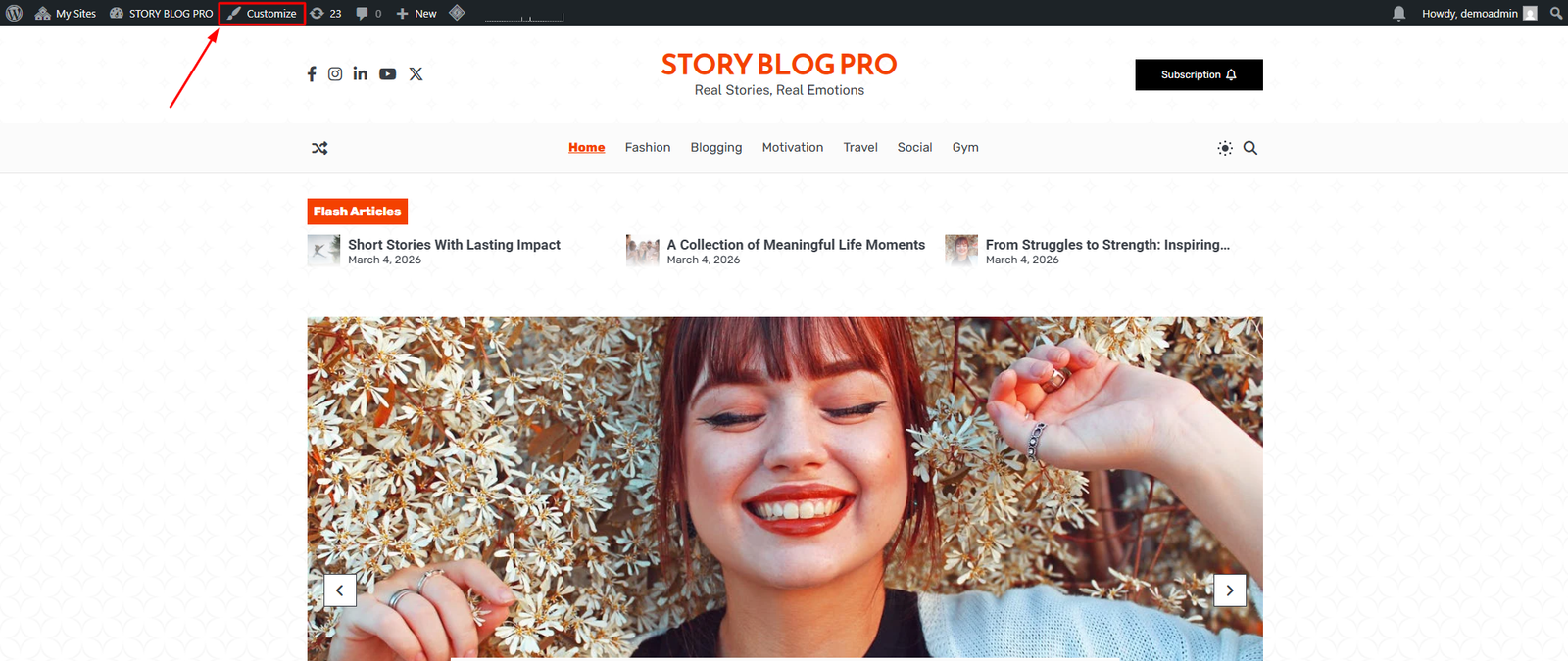 You can access Customize from any page or post on the site, customize option is in the top-left corner, and click on Customize to customize the website.