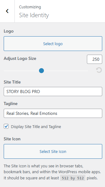 - Display Site Title and Tagline: This option allows users to enable and disable the display of the title and the tagline on the site.