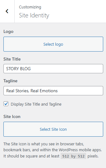 - Site Icon: Upload the Site Icon for the browser icon and app icon for your site. The icon must be square and at least 512px wide and tall.