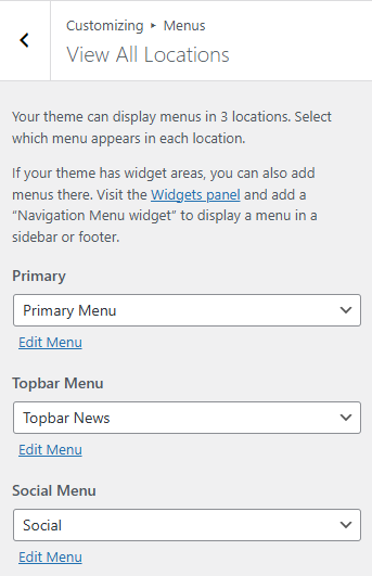 Note: Tune Blog Pro theme has three menu locations provided: Primary menu, Topbar menu, and Social menu.